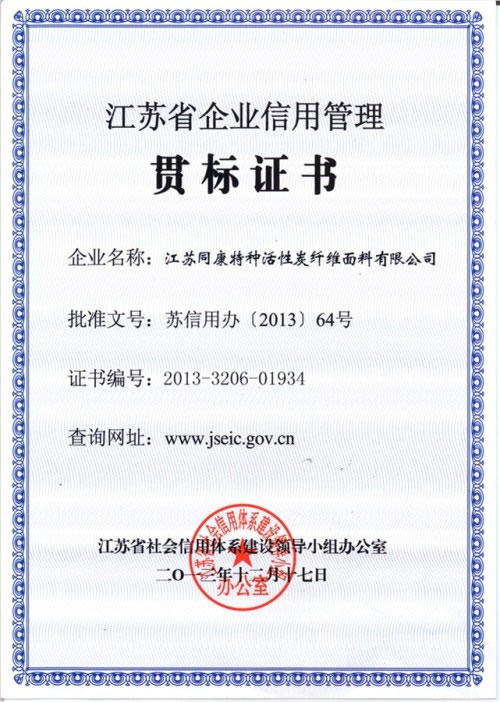 近日,同康公司通過江蘇省社會信用體系建設領導小組辦公室嚴格的審核評定,榮獲江蘇省企業信用管理貫標企業榮譽。